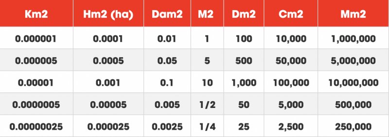 Cách quy đổi những đơn vị khác sang dm2, m2, km2: