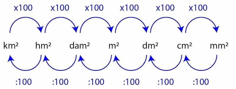 - 1 m² = 100 dm² = 10000 cm² = 1000000 mm²