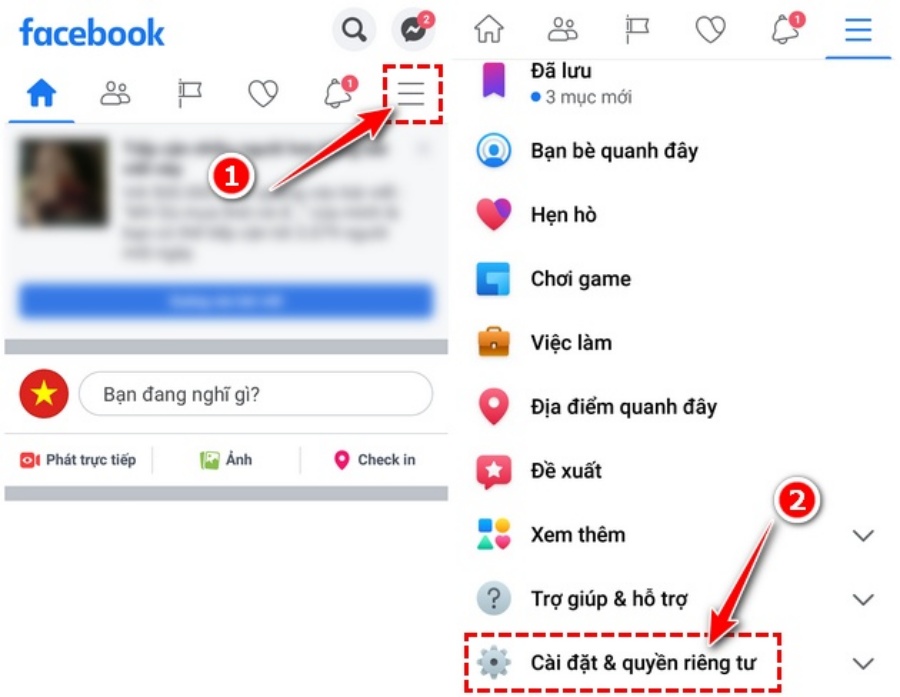 Bước 1: Trước tiên, bạn ấn vào biểu tượng 3 gạch -> Nhấn chọn Cài đặt -> Click vào Cài đặt & quyền riêng tư.