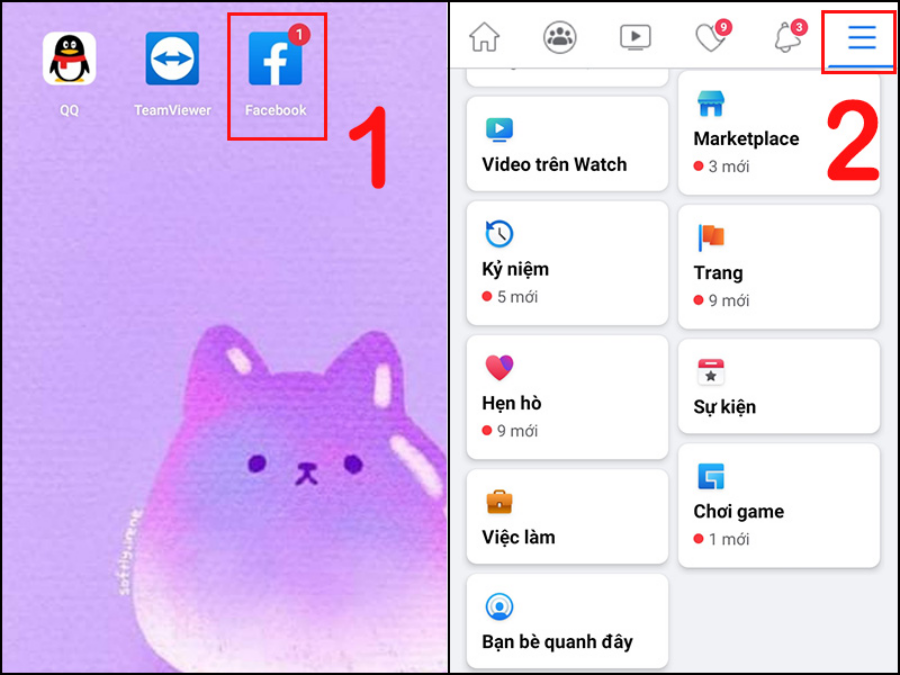 Bước 1: Trước tiên, bạn mở ứng dụng Facebook -> Nhấn chọn ký hiệu menu 3 gạch.