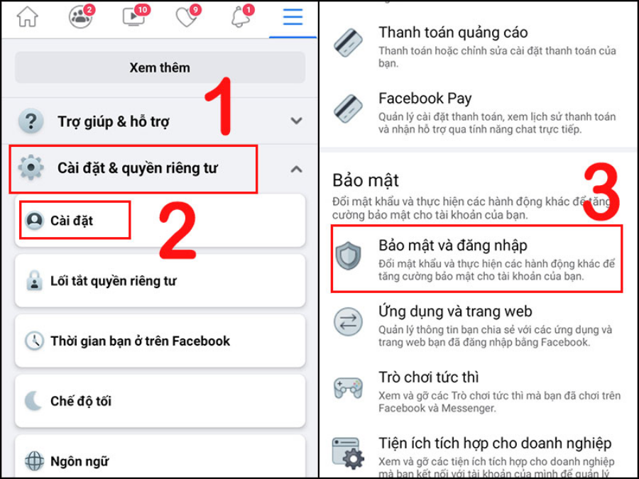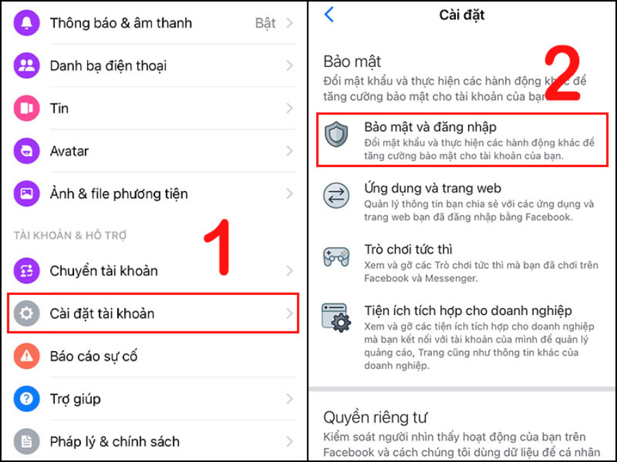 Bước 2: Tiếp theo, bạn chọn Cài đặt & quyền riêng tư -> Ấn vào Cài đặt -> Tại mục Bảo mật, nhấn chọn Bảo mật và đăng nhập.