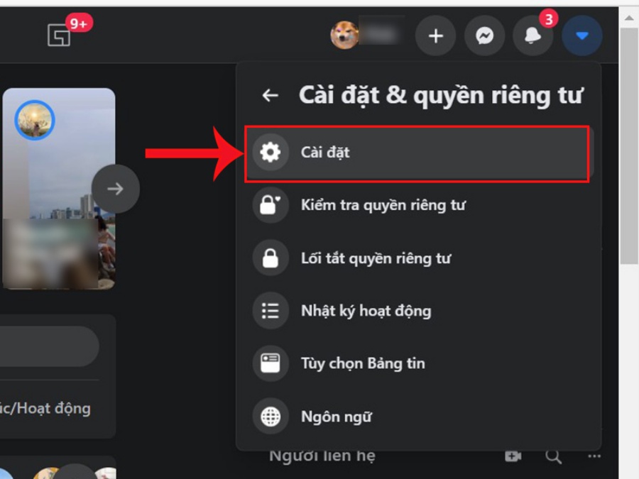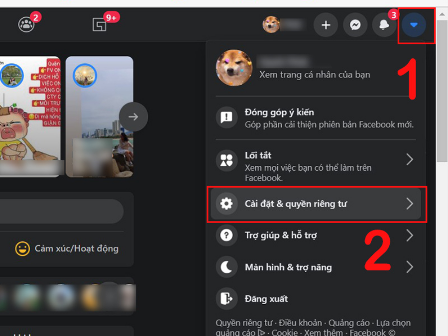 Bước 2: Tiếp theo, nhấn chọn dấu mũi tên góc phải bên trên để mở Menu thả xuống -> Bấm vào Cài đặt & quyền riêng tư.