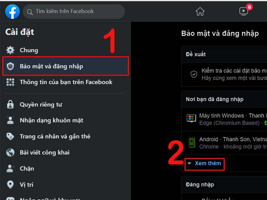Bước 4: Kế đến, bạn tiếp tục chọn Bảo mật và đăng nhập -> Tại mục Nơi bạn đã đăng nhập, bấm vào Xem thêm.