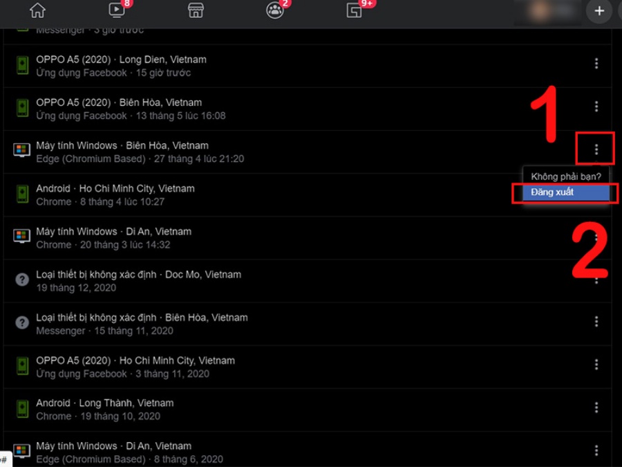 Bước 5: Rồi bạn tiến hành tìm thiết bị bạn muốn đăng xuất tài khoản -> Chọn vào dấu 3 chấm -> Bấm Đăng xuất là xong.