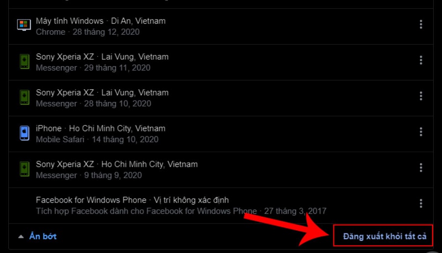 Bước 3: Cuối cùng, click vào Xem thêm -> Bấm chọn dấu 3 chấm góc phải của thiết bị muốn đăng xuất trong danh sách -> Rồi ấn Đăng xuất là hoàn tất.