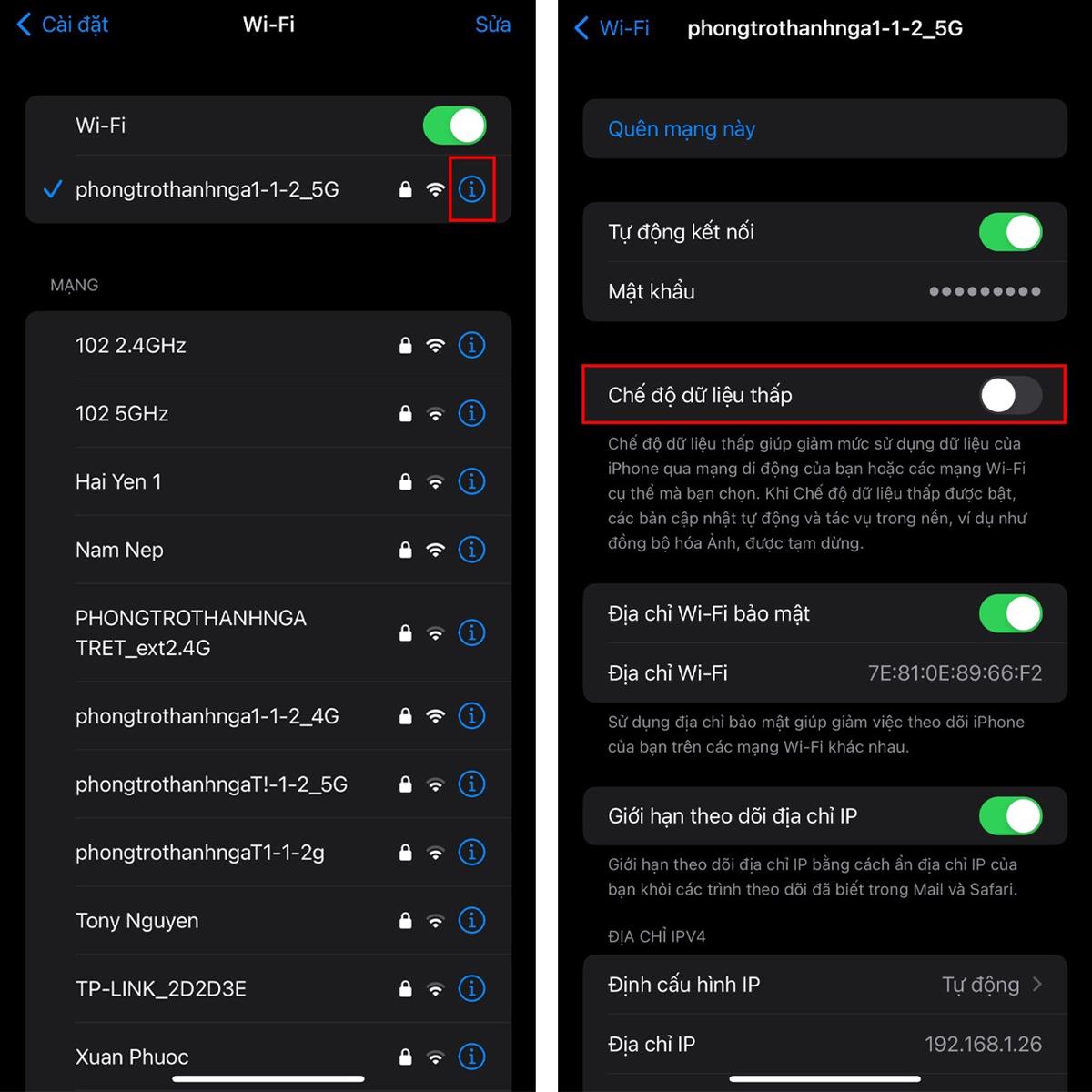 Ở diện thoại, cào Cài đặt > Chọn mục WiFi > Bấm chọn biểu tượng chữ i tại WiFi đang kết nối, tắt Chế độ dữ liệu thấp là hoàn thành.