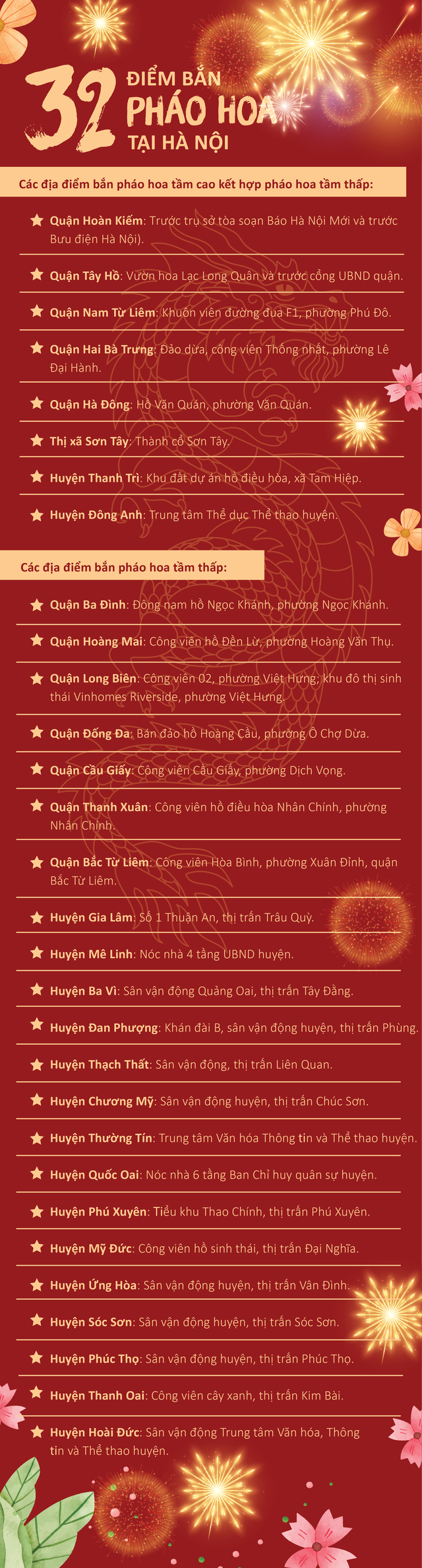 Thay vào đó, Hà Nội dự kiến sẽ có khoảng 32 điểm bắn pháo hoa mừng giao thừa Tết Nguyên đán 2024. Mỗi quận, huyện, thị xã có một điểm bắn, riêng quận Hoàn Kiếm, Hà Nội sẽ có 2 điểm bắn pháo hoa.