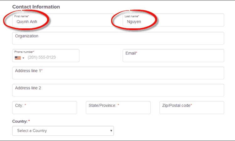 Sẽ có 2 khung liên quan đến họ tên mà bạn cần phải nhập đó chính là First name và Last name. Nếu họ tên của bạn là Nguyễn Minh Châu thì bạn nhập vào khung tương ứng như sau:
