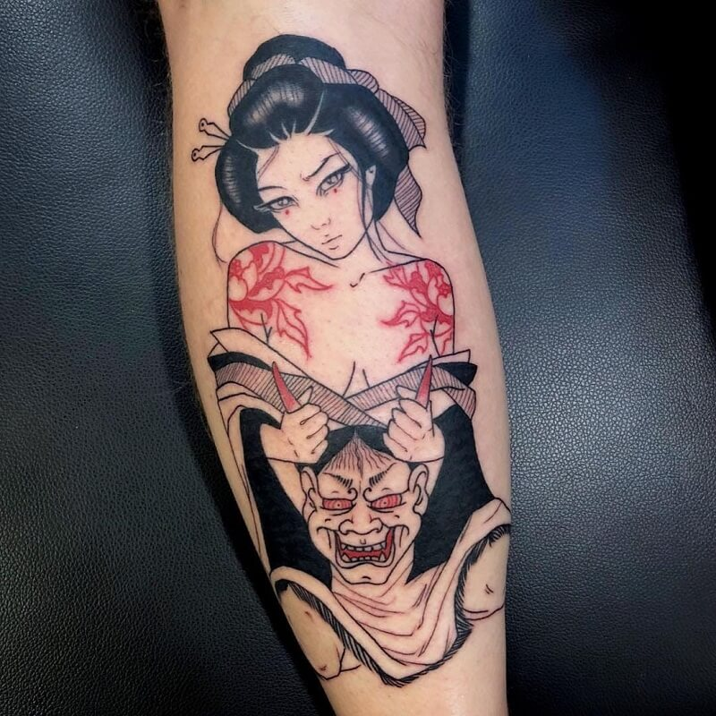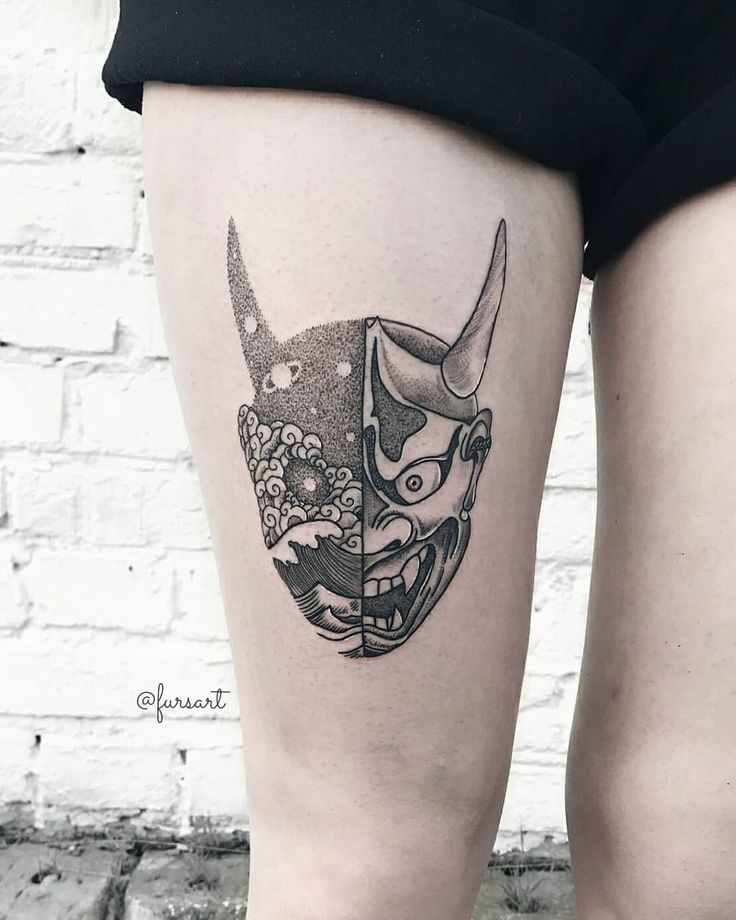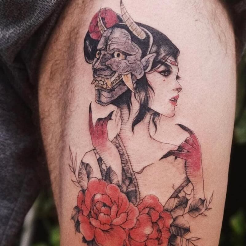 Hình xăm này bắt nguồn từ đất nước Nhật Bản, trải qua một quá trình dài thì hình xăm cũng dần dần được biến tấu và trở thành xu hướng được nhiều bạn trẻ trên khắp các quốc gia yêu thích. Hình xăm chính là hình ảnh mặt quỷ đáng sợ, hung dữ mang đến biểu hiện của sự nóng giận, hận thù.
