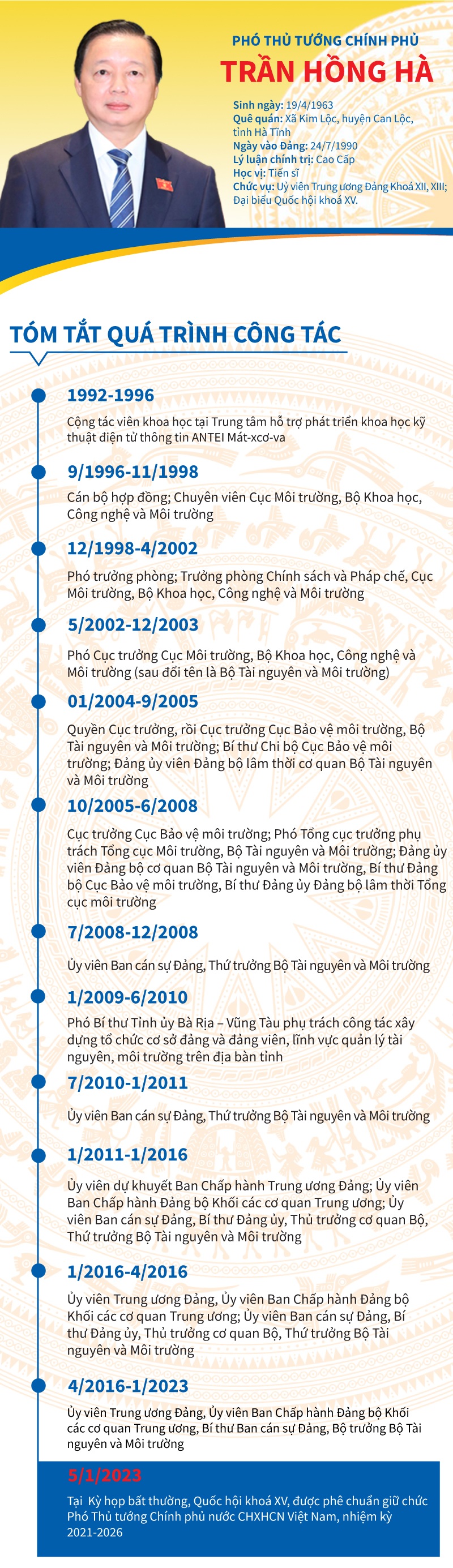 Ngày 05/01/2023: Tại kỳ họp bất thường lần thứ 2 - Quốc hội khóa XV, đồng chí Trần Hồng Hà được Quốc hội phê chuẩn bổ nhiệm chức vụ Phó Thủ tướng Chính phủ.