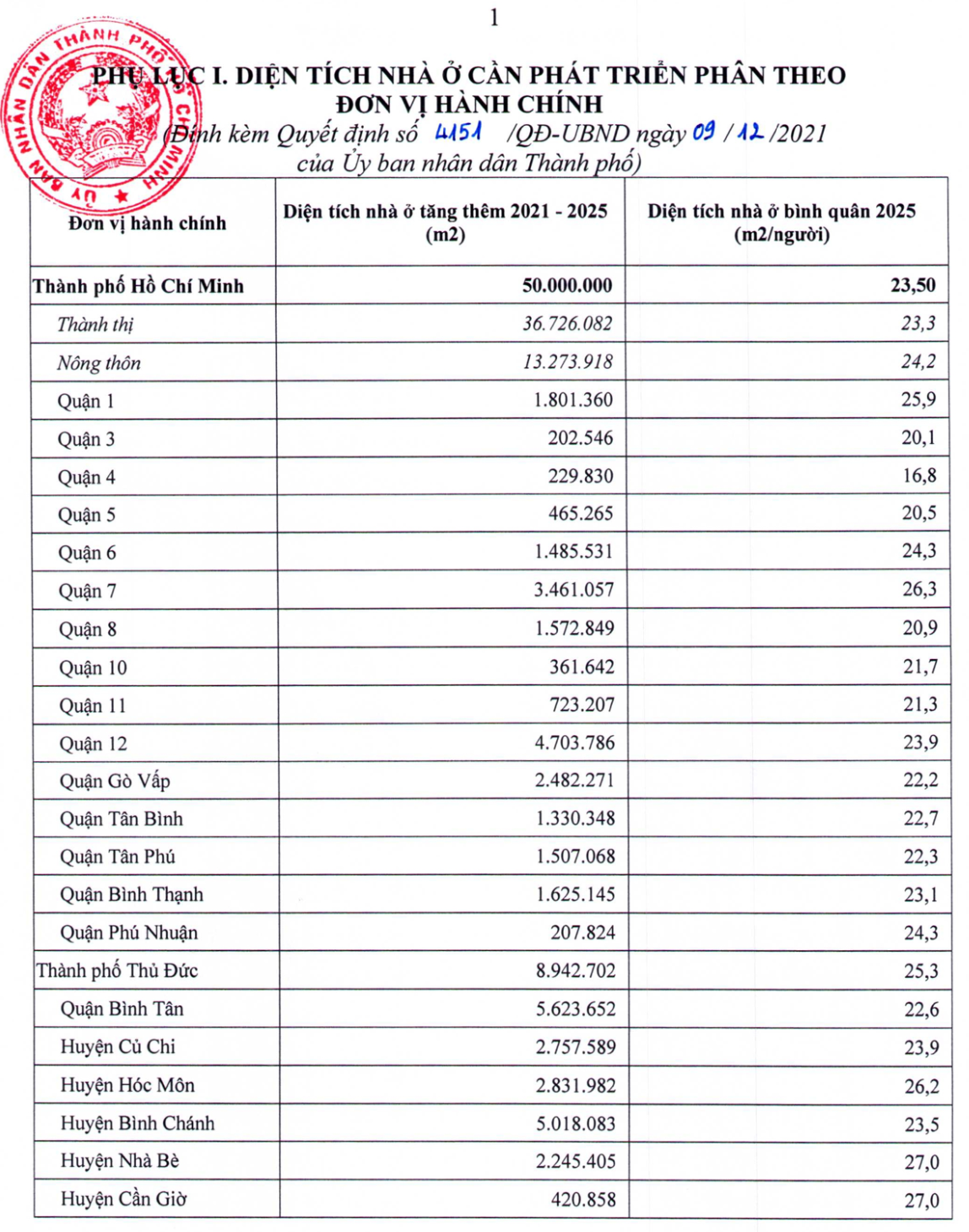 Theo đó, tổng diện tích sàn nhà ở tại thành phố Hồ Chí Minh tăng thêm tối thiểu từ nay đến năm 2025 là 50 triệu m²; chỉ tiêu diện tích nhà ở bình quân đầu người tối thiểu khoảng 23,5m²/người. Trong đó, khu vực trung tâm hiện hữu là 25,6m²/người, khu vực nội thành hiện hữu 22,5m²/người, khu vực nội thành phát triển 23,9m²/người và khu vực 5 huyện ngoại thành 24,2m²/người.