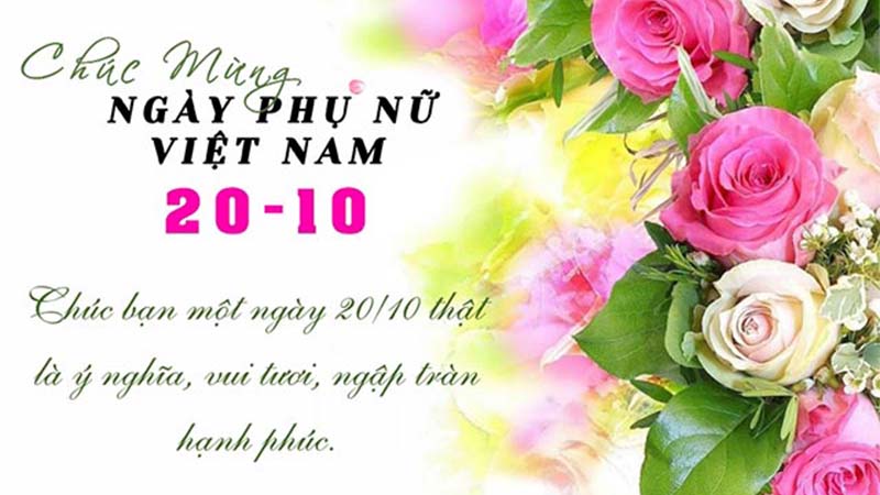 - Mừng ngày Phụ nữ Việt Nam 20/10, chúc cho toàn thể đồng nghiệp/khách hàng luôn xinh đẹp, rạng rỡ tỏa sáng. Mỗi người sẽ tìm được một hạnh phúc, tình yêu vừa vặn với chính con người của mình.