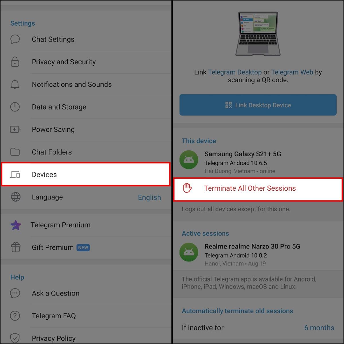 Tại đây, bạn kiểm soát được những thiết bị đã và đang đăng nhập vào tài khoản Telegram của mình.