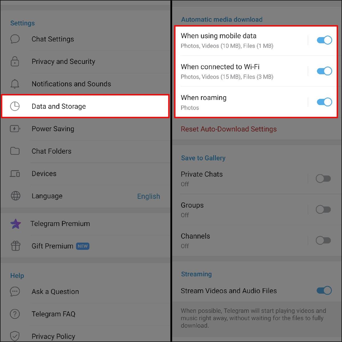 Trong Cài đăt (Settings) > Chọn Dữ liệu và lưu trữ (Data and Storage) > Sau đó, hãy tắt hết 3 mục trong Tự động tải đa phương tiện (Automatic media download) là xong.