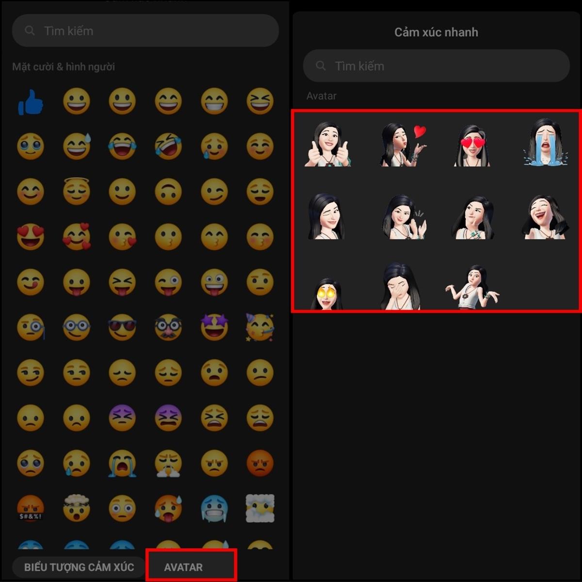 Bước 2: Trong danh sách các biểu tượng cảm xúc, nhấn chọn Avatar > Lựa chọn các cảm xúc theo Avatar mà bạn yêu thích và hoàn thành.
