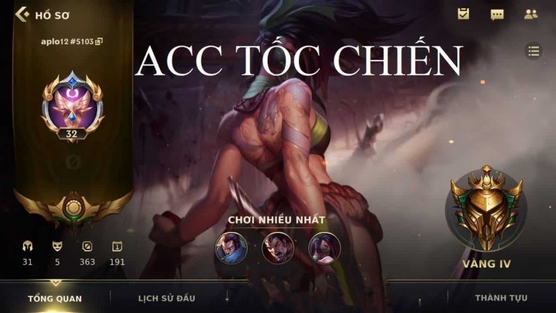 Acc Tốc Chiến là từ viết tắt của "Account Tốc Chiến", đây là một tài khoản cá nhân mà người chơi sử dụng để truy cập và tham gia vào trò chơi. Mỗi acc Tốc Chiến bao gồm thông tin cá nhân của người chơi như tên, hình ảnh đại diện, cũng như tiến trình và thành tựu trong trò chơi như cấp độ, điểm kỹ năng và danh hiệu.