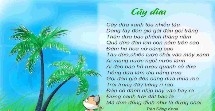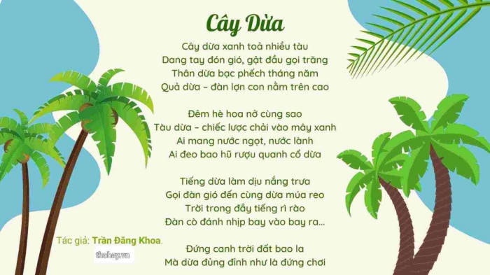 Trên đây là những bài thơ cây dừa của Trần Đăng Khoa do đội ngũ INVERT tổng hợp. Hy vọng bài viết sẽ giúp bé hiểu được ý nghĩa của bài thơ và có thêm nhiều ý tưởng để sáng tác những bài thơ về cây dừa cũng như phát triển tư duy nhanh chóng.