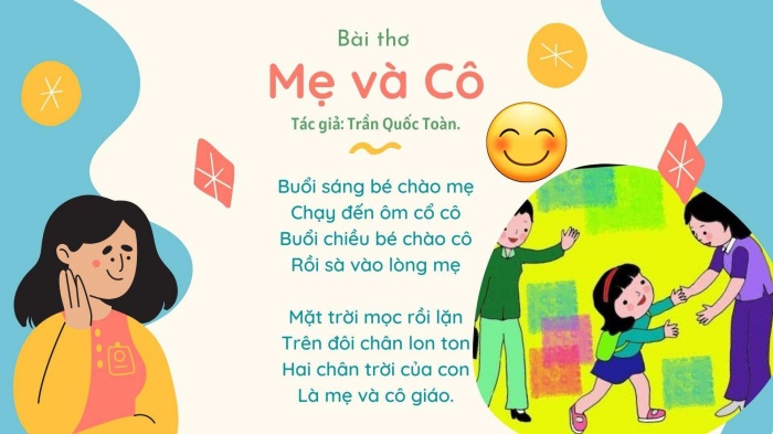 Cô giáo nói: Để biết rõ về bài thơ này, bây giờ chúng mình cùng lắng nghe cô đọc bài thơ: "Cô và mẹ" do nhà thơ Trần Quốc Toàn sáng tác nhé!