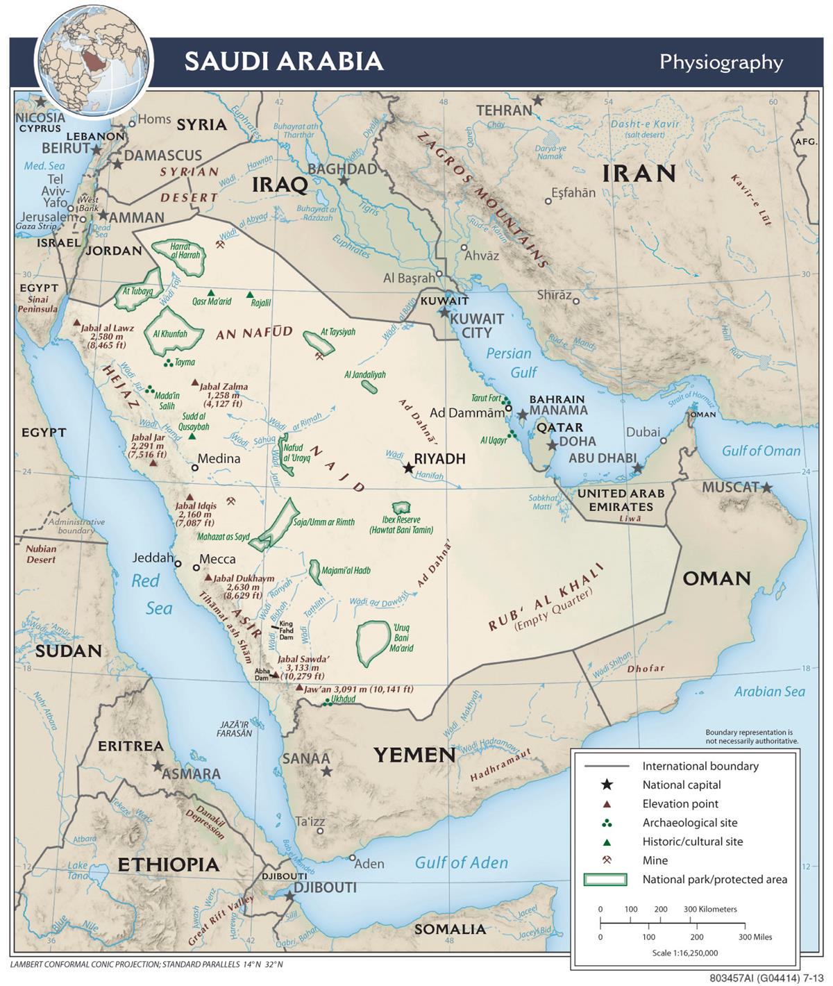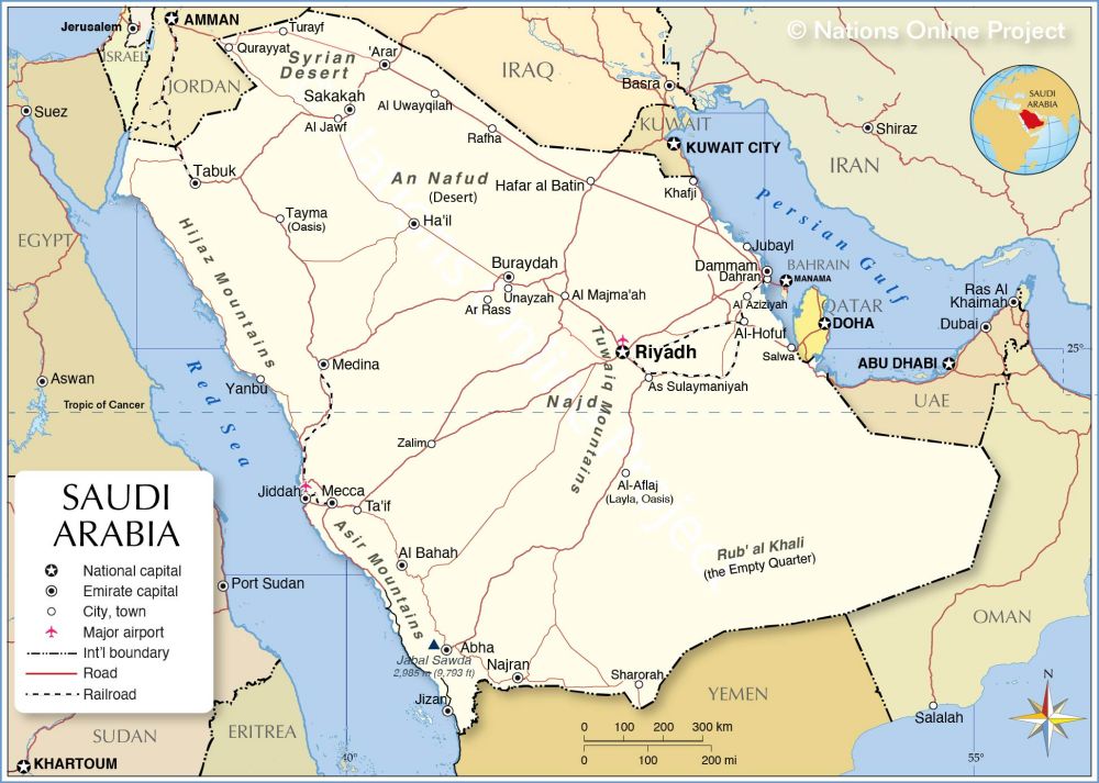 Vị trí địa lý: Nằm ở Trung Đông, giáp I-rắc, Gioóc-đa-ni, Cô-oét, vịnh Péc-xích, Ca-ta, Các tiểu vương quốc A-rập thống nhất, Ô-man, Yê-men, biển Đỏ. Tọa độ: 25000 vĩ bắc, 45000 kinh đông.