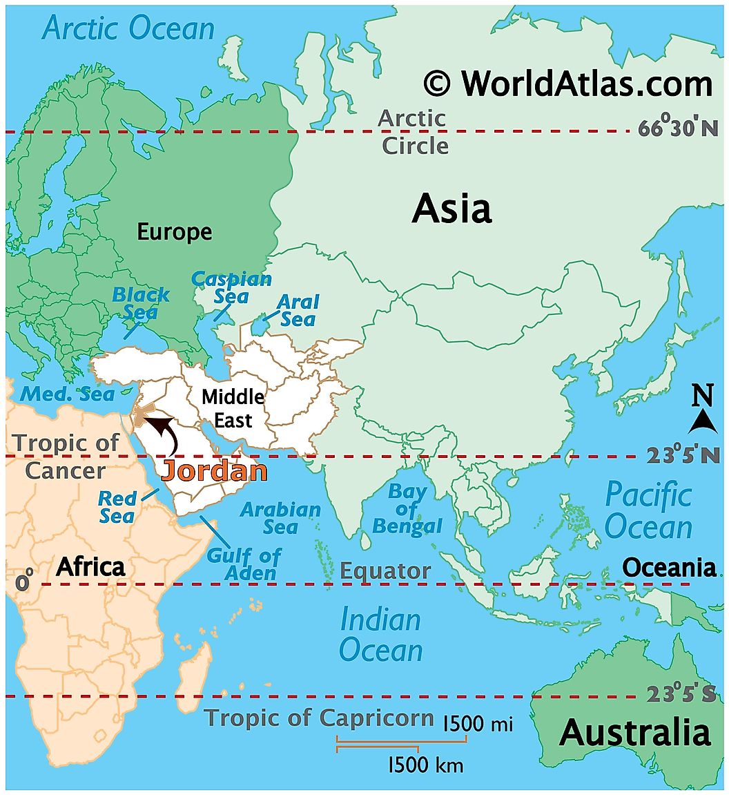 Vị trí địa lý: Nằm ở Trung Đông, giáp Xy-ri, I-rắc, A-rập Xê-út, I-xra-en, Địa Trung Hải, Pa-le-xtin. Tọa độ: 31000 vĩ bắc, 36000 kinh đông.