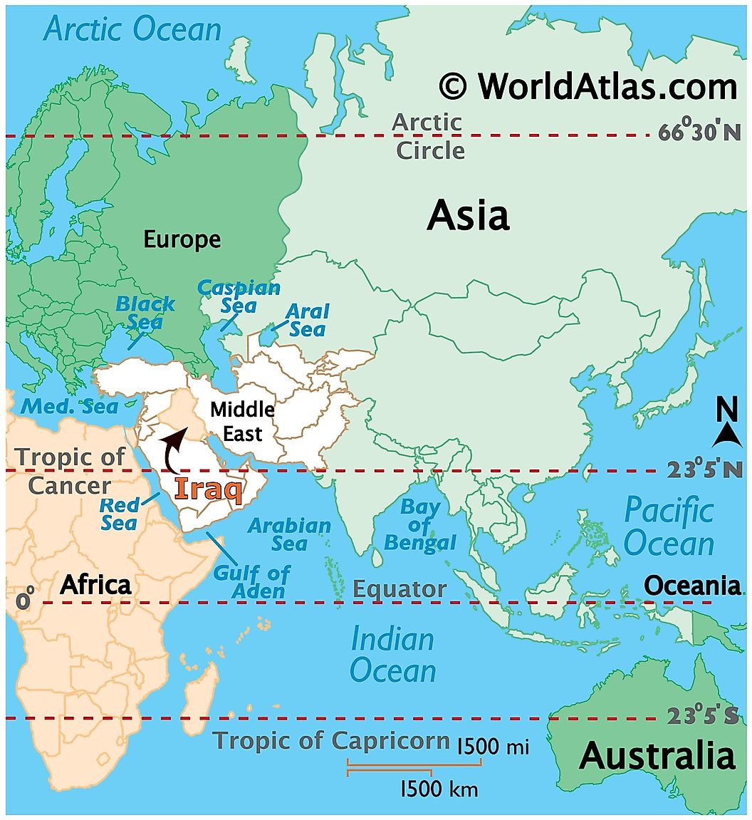 Vị trí địa lý: Nằm ở Trung Đông, giáp Thổ Nhĩ Kỳ, I-ran, vịnh Péc-xích, Cô-oét, A-rập Xê-út, Gioóc-đa-ni, Xy-ri. Tọa độ: 33000 vĩ bắc, 44000 kinh đông.
