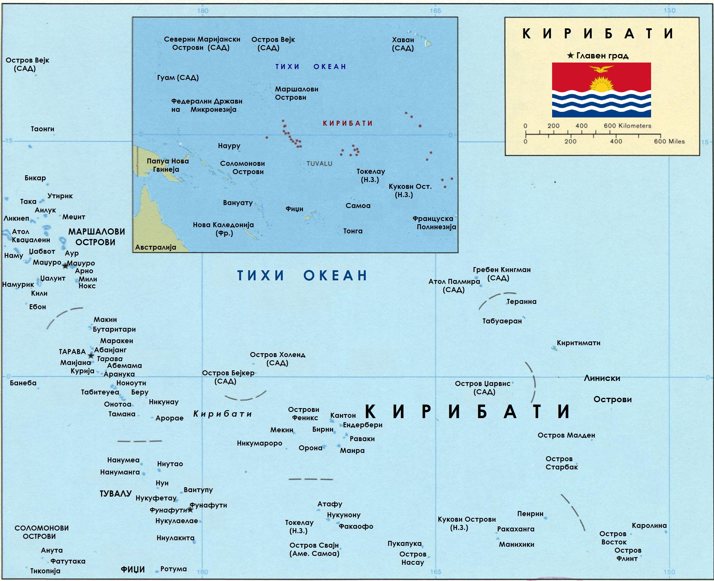 Vị trí địa lý: Ki-ri-ba-ti nằm ở phía tây Thái Bình Dương, gồm quần đảo Phê-ních (8 đảo), quần đảo Lain (8 đảo) và quần đảo Gin-bớt. Tọa độ: 1025 vĩ bắc, 173000 kinh đông.