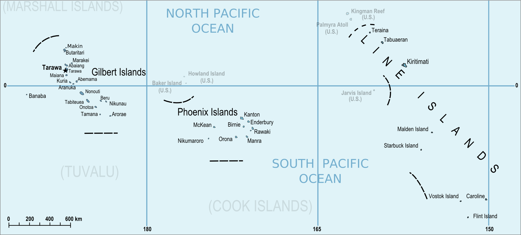 Lịch sử: Người Anh đã phát hiện ra quần đảo này vào năm 1788. Trong những năm 1892 - 1915, quần đảo Gin-bớt và En-lít (Tu-va-lu) là thuộc địa của Anh. Năm 1941 - 1943, Nhật Bản chiếm quần đảo này. Sau chiến tranh Anh tiếp tục chiếm làm thuộc địa. Ngày 12-7-1979, trở thành nước độc lập với tên gọi Ki-ri-ba-ti.