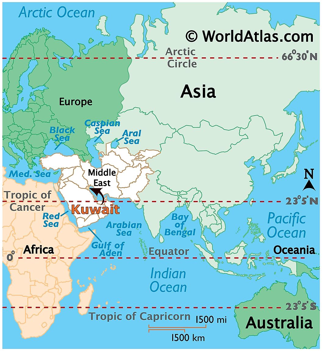 Vị trí địa lý: Nằm ở Trung Đông, phía tây bắc bán đảo A-rập, giáp vịnh Péc-xích, A-rập Xê-út, I-rắc. Tọa độ: 29030 vĩ bắc, 45045 kinh đông.
