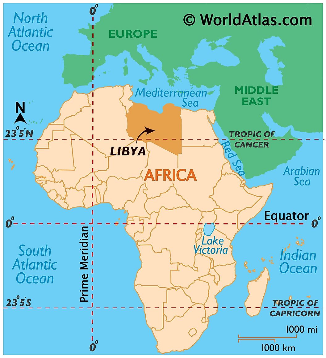 Vị trí địa lý: Nằm ở Bắc Phi, giáp Địa Trung Hải, Ai Cập, Xu-đăng, Sát, Ni-giê, An-giê-ri và Tuy-ni-di. Tọa độ: 25000 vĩ bắc, 17000 kinh đông.