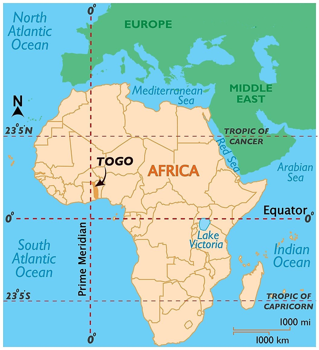 Vị trí địa lý: Nằm ở phía tây châu Phi, giáp Buốc-ki-na Pha-xô, Bê-nanh, vịnh Ghi-nê và Ga-na. Tọa độ: 8o00 vĩ bắc 1o10 kinh đông.