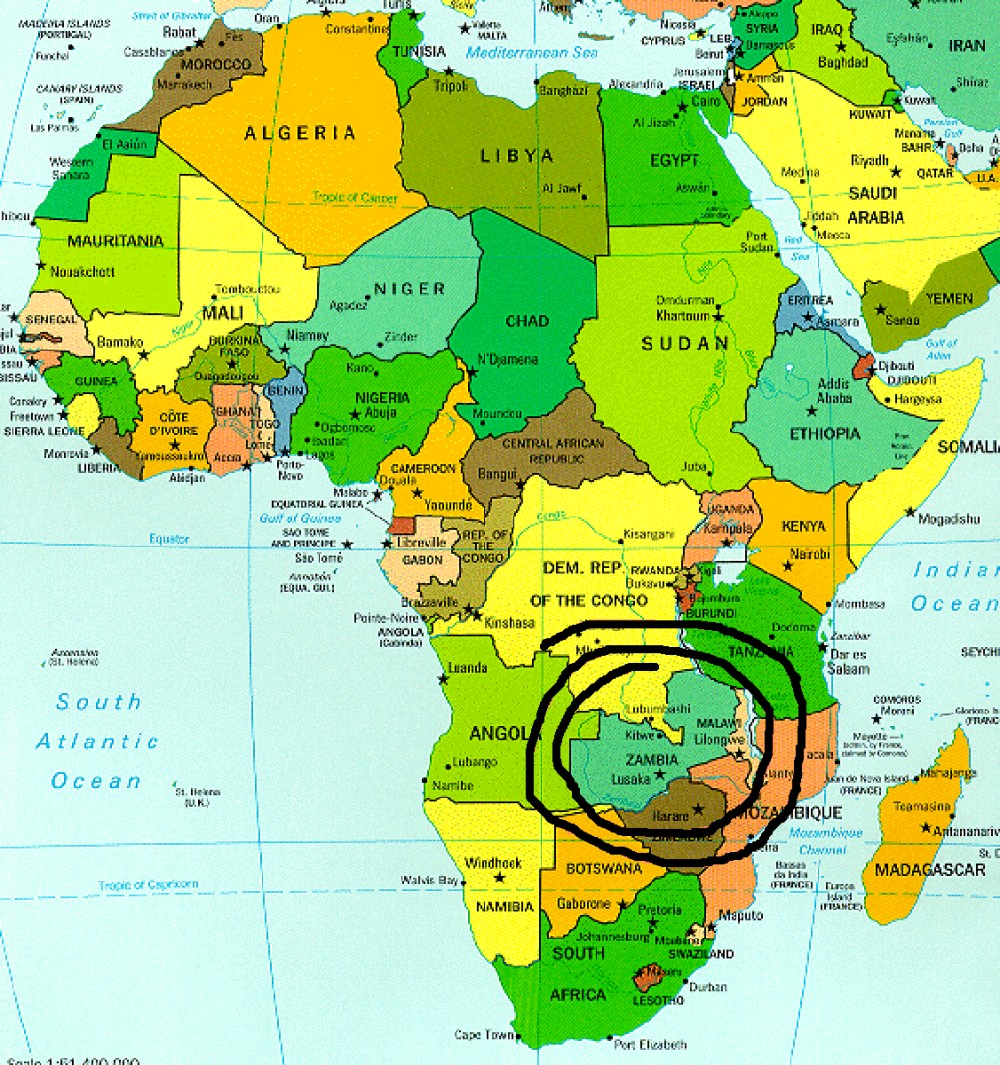 Vị trí địa lý: Nằm ở miền Nam châu Phi, giáp Cộng hòa dân chủ Công-gô, Tan-da-ni-a, Ma-la-uy, Mô-dăm-bích, Dim-ba-bu-ê, Na-mi-bi-a, Ăng-gô-la. Tọa độ: 15000 vĩ nam, 30000 kinh đông.