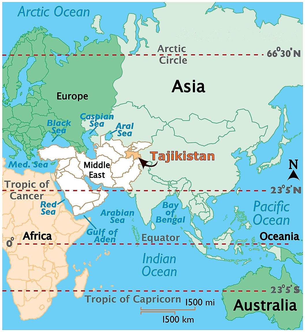 Vị trí địa lý: Nằm ở Trung Á, giáp Cư-rơ-gư-xtan, Trung Quốc, Áp-ga-ni-xtan, U-dơ-bê-ki-xtan. Tọa độ: 39000 vĩ bắc 71000 kinh đông.