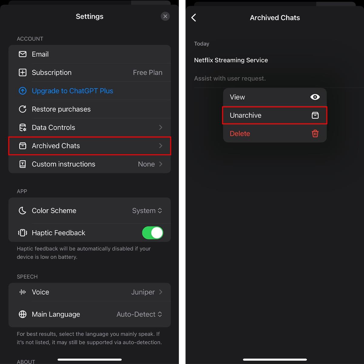 Bước 1: Vào ứng dụng ChatGPT > Tại giao diện chính của ChatGPT, chọn vào biểu tượng 3 gạch phía trên góc trái màn hình > Chọn Nhấn giữ vào cuộc trò chuyện bạn muốn ẩn > Chọn danh mục Archive > Chọn tiếp vào mục Archive là ngay lập tức cuộc trò chuyện sẽ được ẩn.