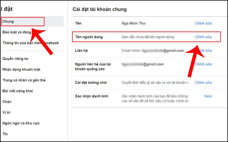 Bước 2: Tại phần Cài đặt tài khoản chung, bạn chọn vào Chỉnh sửa trong phần Tên người dùng.