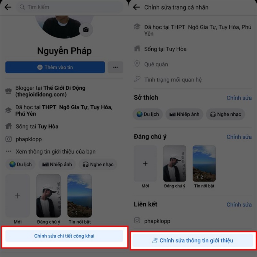 Bước 1: Trước tiên, bạn vào trang cá nhân chính của bản thân -> Bấm vào biểu trượng Menu trên thanh công cụ -> Ấn chọn trang các nhân -> Nhấn chọn Chỉnh sửa chi tiết công khai -> Bạn kéo xuống dưới cùng và click chọn Chỉnh sửa thông tin giới thiệu.