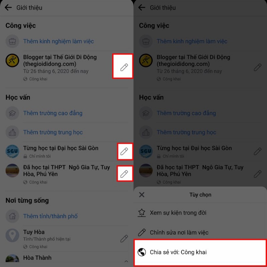 Bước 2: Sau đó, tại mục Công việc và Học vấn, bạn ấn chọn biểu tượng bút chì ở phía sau mỗi nội dung -> Nhấn chọn chế độ chia sẻ và chuyển thành chế độ mà bạn muốn