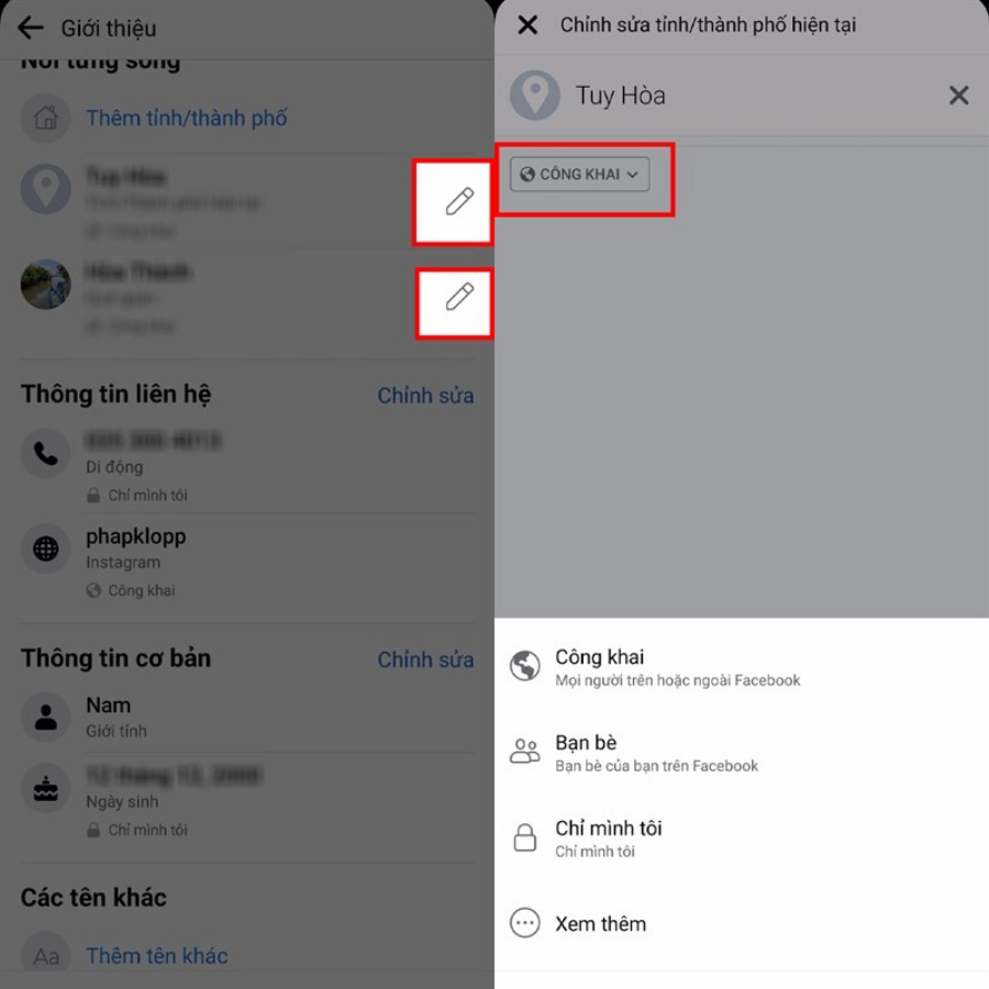 Bước 3: Tiếp theo, tại mục Nơi từng sống, bạn bấm vào biểu tượng bút chì ở phía sau mỗi nội dung. Khi đó, bạn sẽ được đưa đến một màn hình mới -> Bạn chọn vào chế độ chia sẻ ở bên dưới địa điểm -> Ấn vào Chỉ mình tôi hoặc Xem thêm để xem nhiều hơn các chế độ chia sẻ.