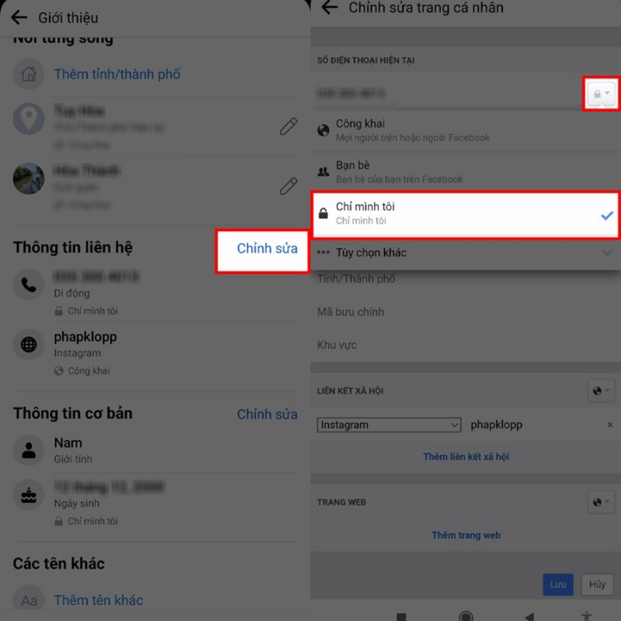 Bước 4: Kế đến, tại phần Thông tin liên hệ -> Nhấn chọn Chỉnh sửa -> Ấn vào biểu tượng chế độ chia sẻ -> Bấm chọn Chỉ mình tôi để ẩn nó đi nhé.