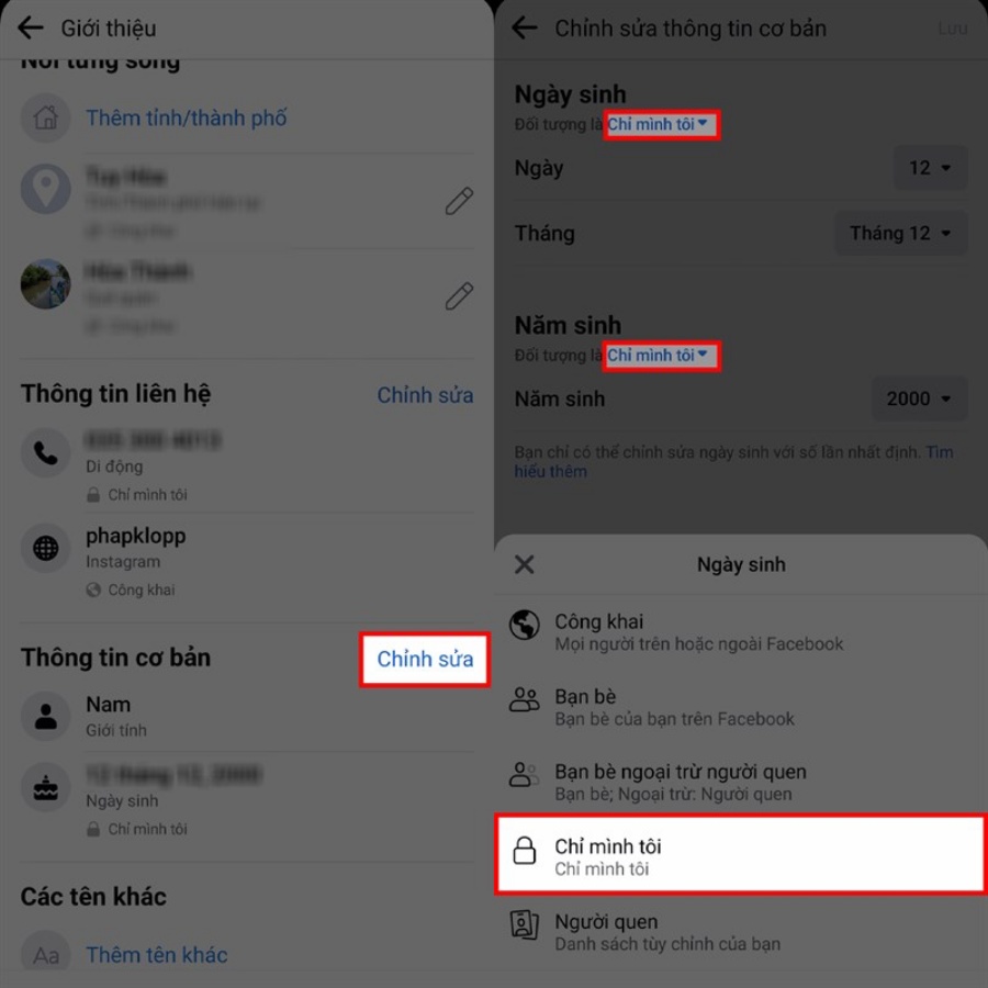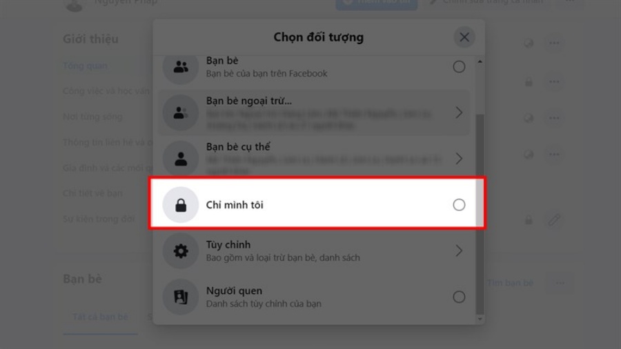 Bước 4: Cuối cùng, bạn chọn Chỉ mình tôi để ẩn các thông tin không cần thiết. Đặc biệt, bạn có thể làm tương tự với các mục thông tin còn lại là hoàn tất rồi đấy.