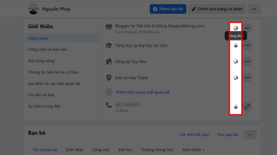 Bước 3: Sau đó, tại mục Giới thiệu -> Nhấn vào biểu tượng chế độ chia sẻ thông tin ở phía sau mỗi thông tin.