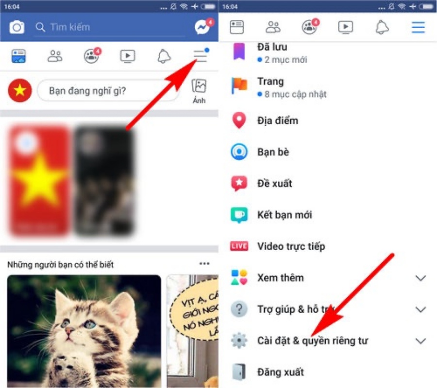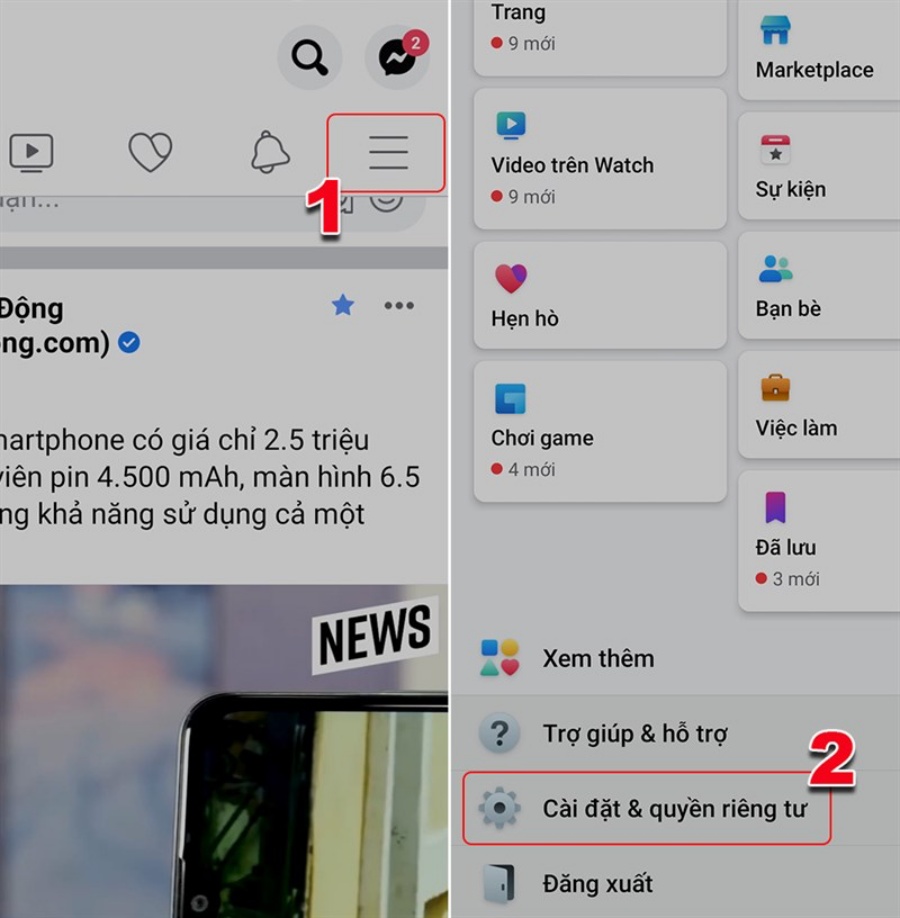 Bước 1: Đầu tiên, bạn bấm vào biểu tượng 3 gạch -> Nhấn chọn Cài đặt -> Click chọn Cài đặt & quyền riêng tư.