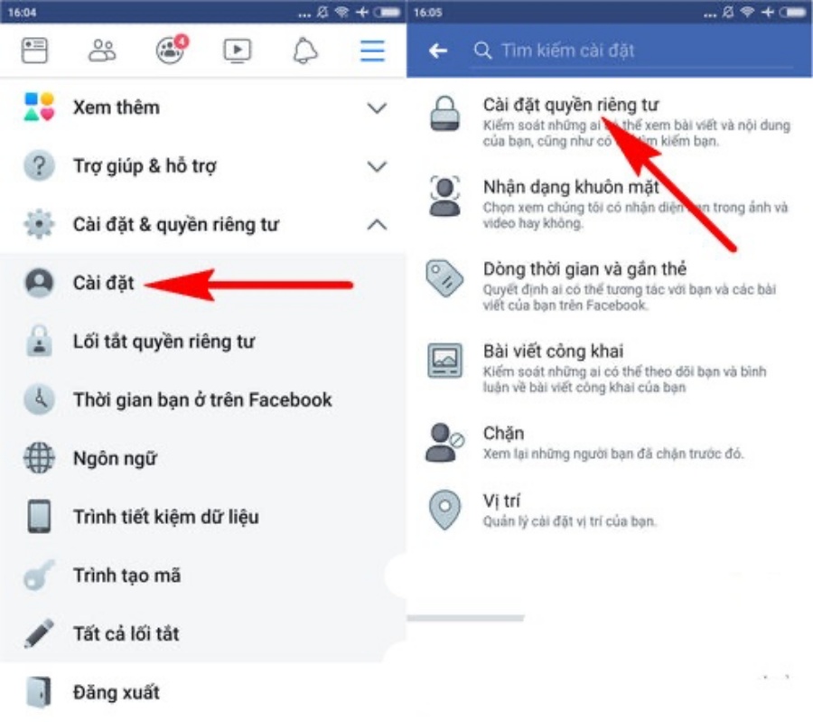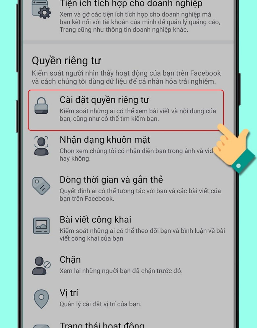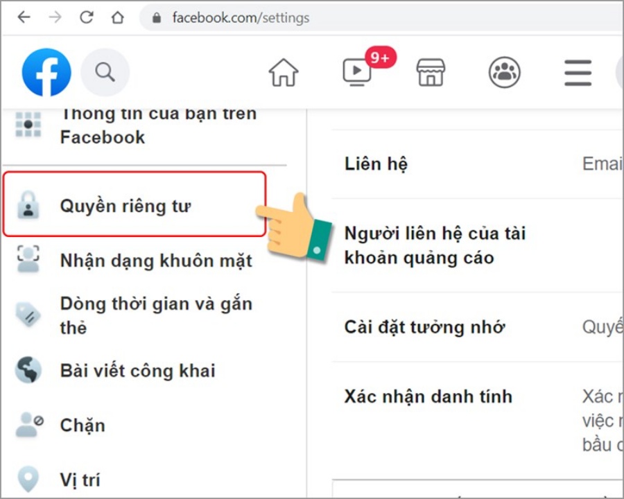 Bước 3: Kế đến, để có thể không cho người khác tìm thấy Facebook, bạn tiếp tục ấn chọn Cài đặt -> Ấn chọn thông tin Cài đặt riêng tư.