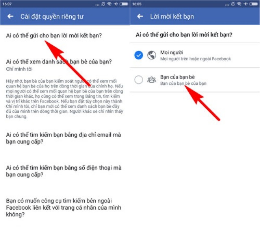 Bước 4: Tiếp đến, bạn vào mục mọi người tìm và liên hệ với bạn -> Ấn chọn tùy chỉnh quyền riêng tư -> Tiến hành tắt tính năng Ai có thể gửi lời mời kết bạn -> Nhấn chọn mục Bạn của bạn bè.