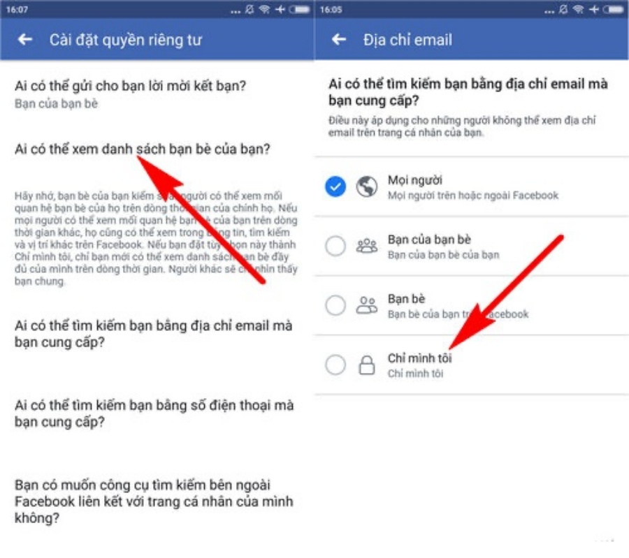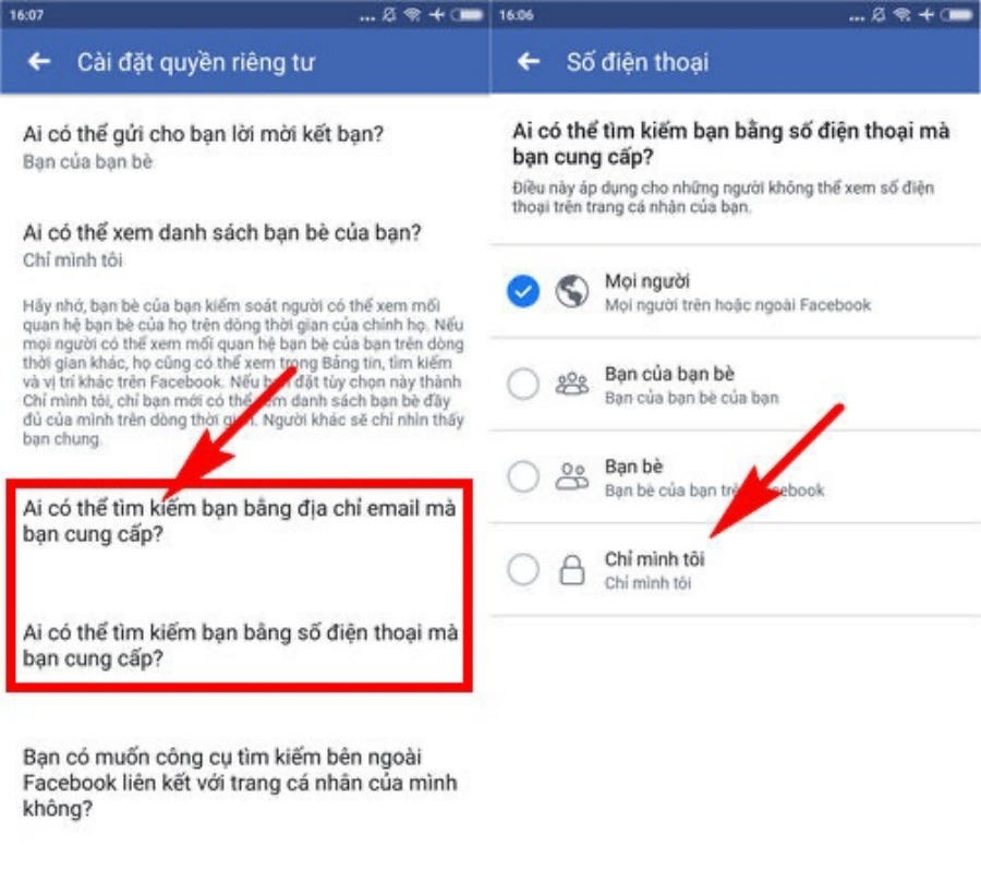 Bước 6: Kế đến, bạn vào mục Chỉ mình tôi với thông tin Ai có thể tìm kiếm bạn bằng số điện thoại và Ai có thể tìm kiếm bạn bằng địa chỉ Email.