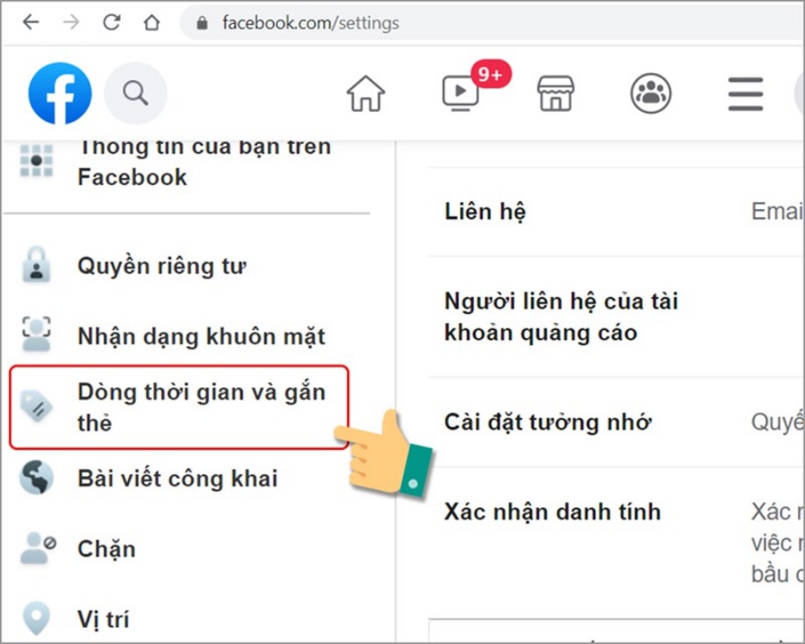 Bước 2: Tiếp theo, tại giao diện tài khoản, người dùng, bạn ấn vào mục Dòng thời gian và gắn thẻ (Timeline and Tagging).