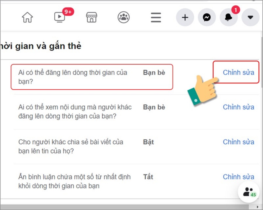 Khi đó, tại phần Ai có thể thêm nội dung vào dòng thời gian của bạn (Who can post on your Timeline?), theo mặc định sẽ để ở chế độ Bạn bè (Friends). Cho nên, để thay đổi, bạn chọn vào Chỉnh sửa (Edit) ở bên cạnh.
