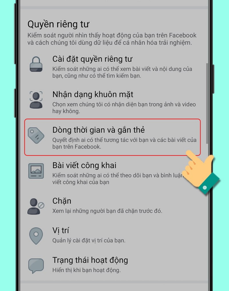 Bước 3: Kế đến, bạ cuộn xuống Quyền riêng tư -> Bấm chọn vào Dòng thời gian và gắn thẻ.