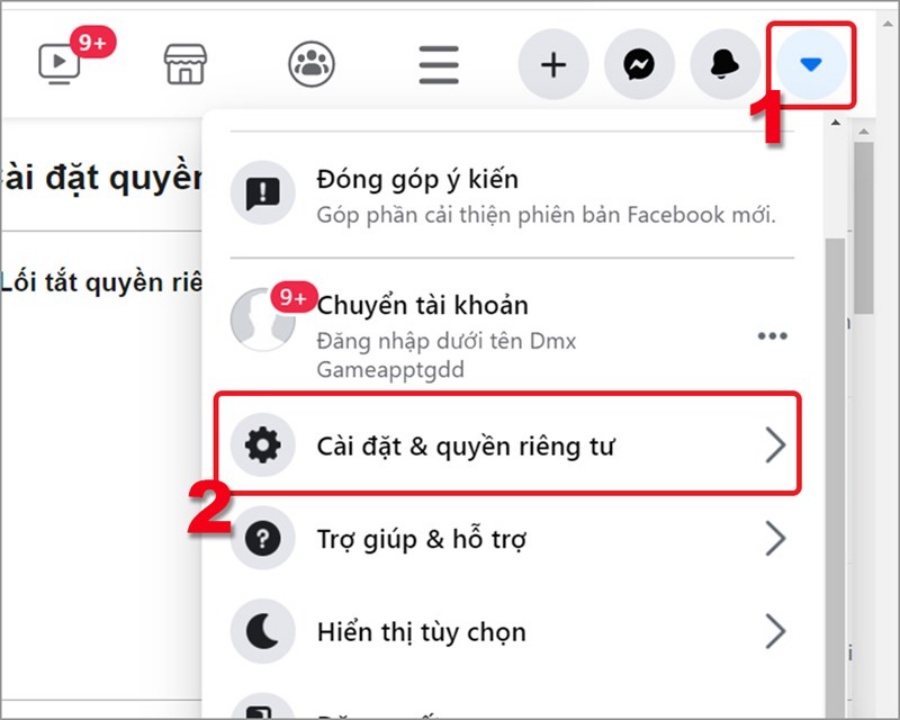 Bước 1: Đầu tiên, bạn đăng nhập vào tài khoản Facebook -> Ấn vào hình tam giác hướng xuống -> Nhấn chọn Cài đặt & quyền riêng tư.