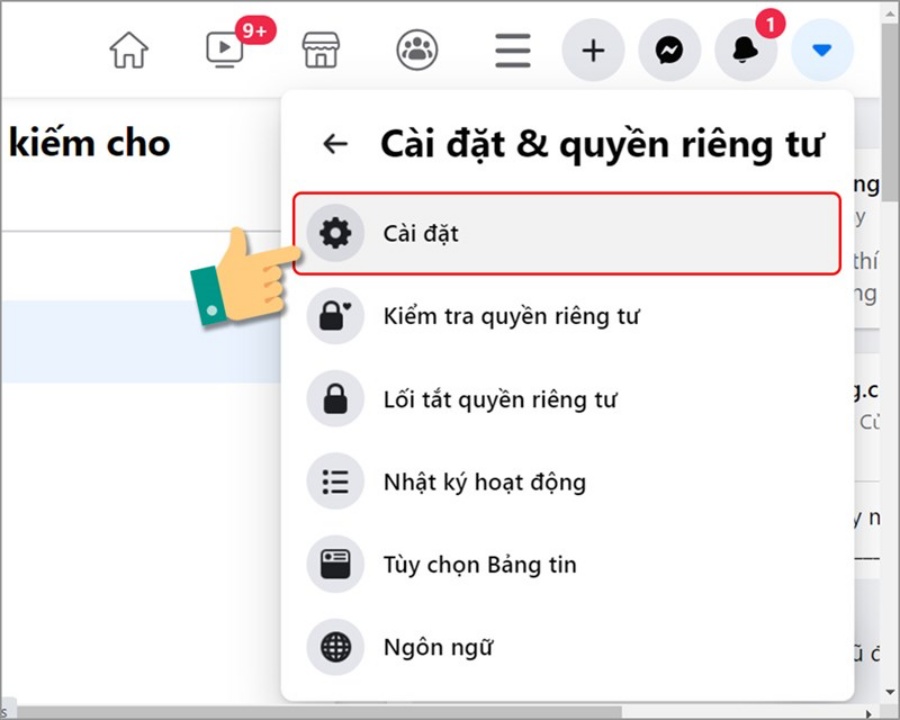 Bước 1: Đầu tiên, bạn tuy cập vào Facebook cá nhân -> Tại giao diện chính của Facebook, bạn bấm vào biểu tượng mũi tên -> Nhấn chọn Cài đặt & và quyền riêng tư -> Ấn Cài đặt.