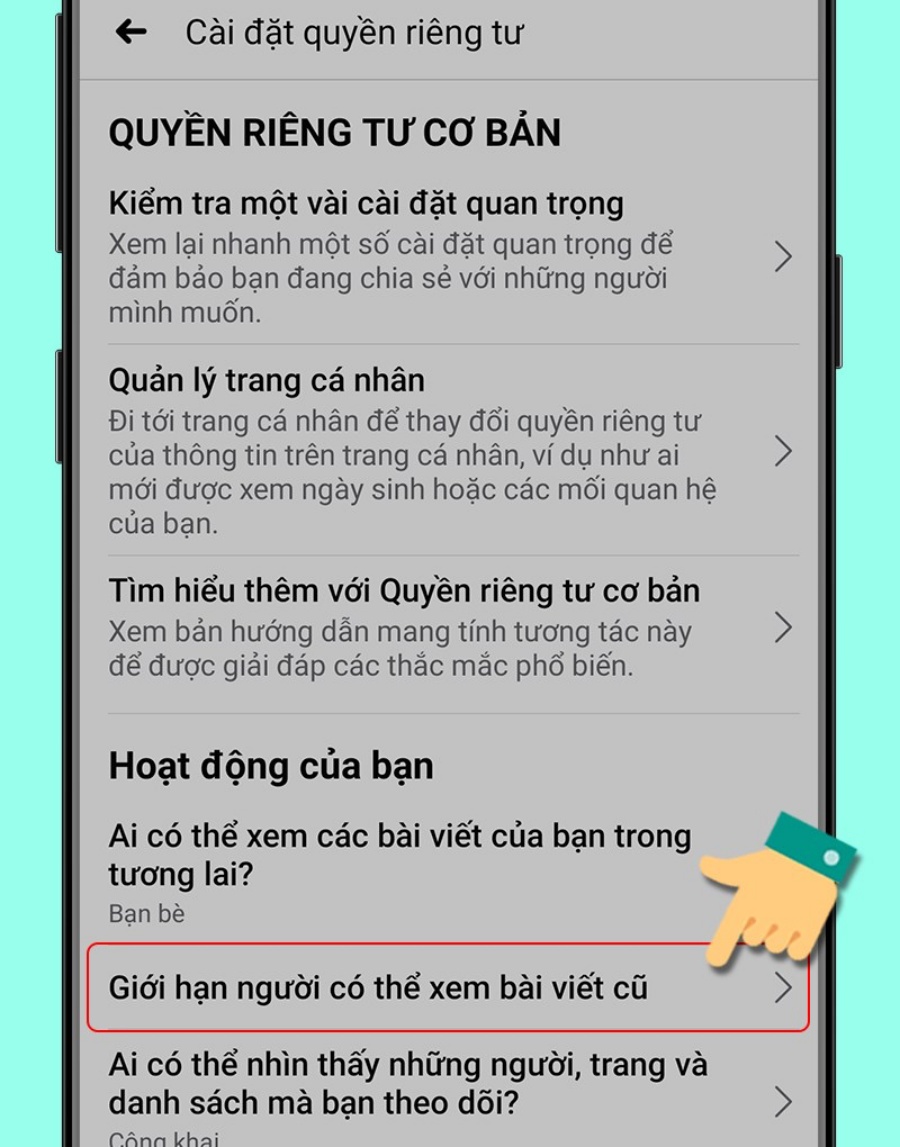Bước 3: Sau đó, tại mục Hoạt động -> Click chọn Giới hạn người có thể xem bài viết cũ.